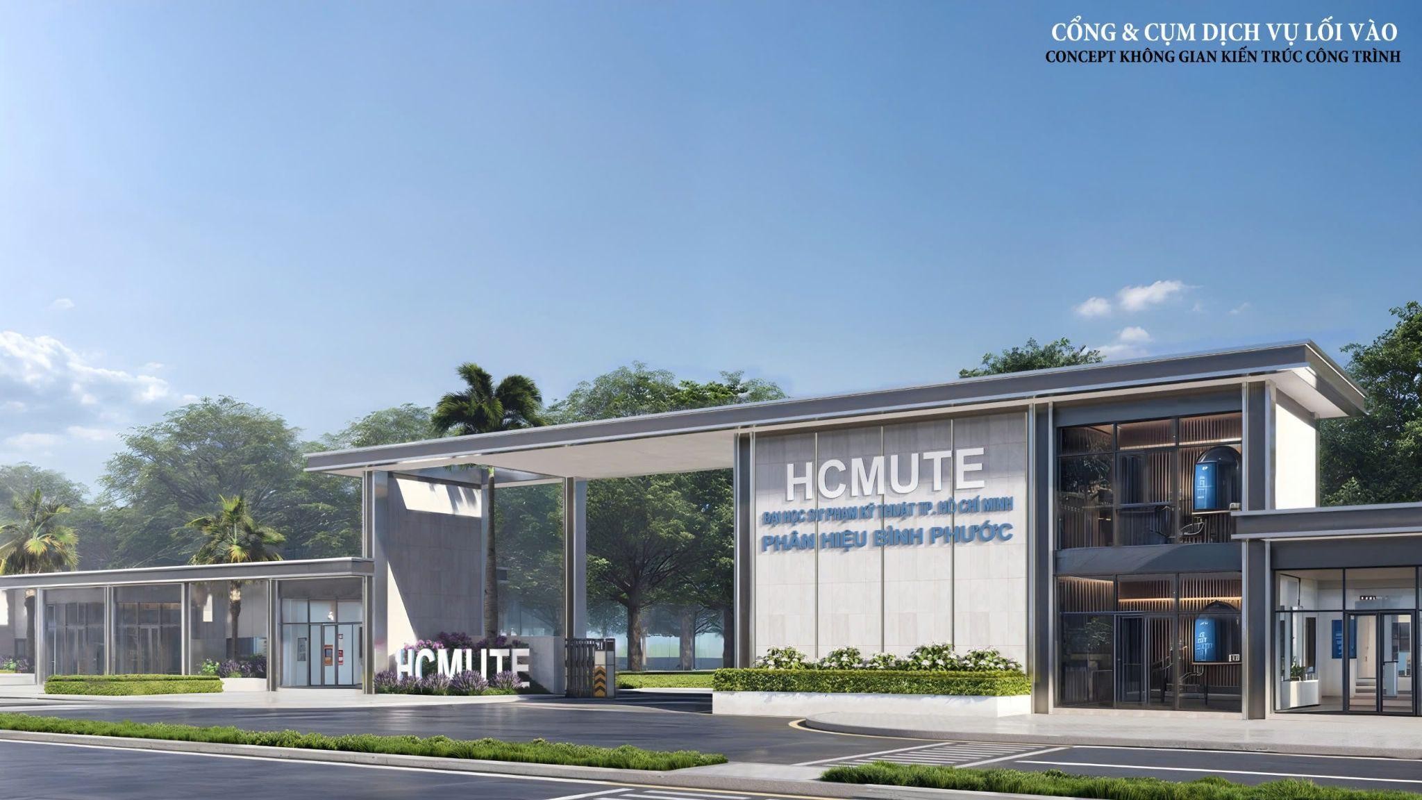 Phối cảnh Cổng và cụm dịch vụ lối vào của phân hiệu Trường Đại học Sư phạm Kỹ thuật TP.HCM tại Bình Phước